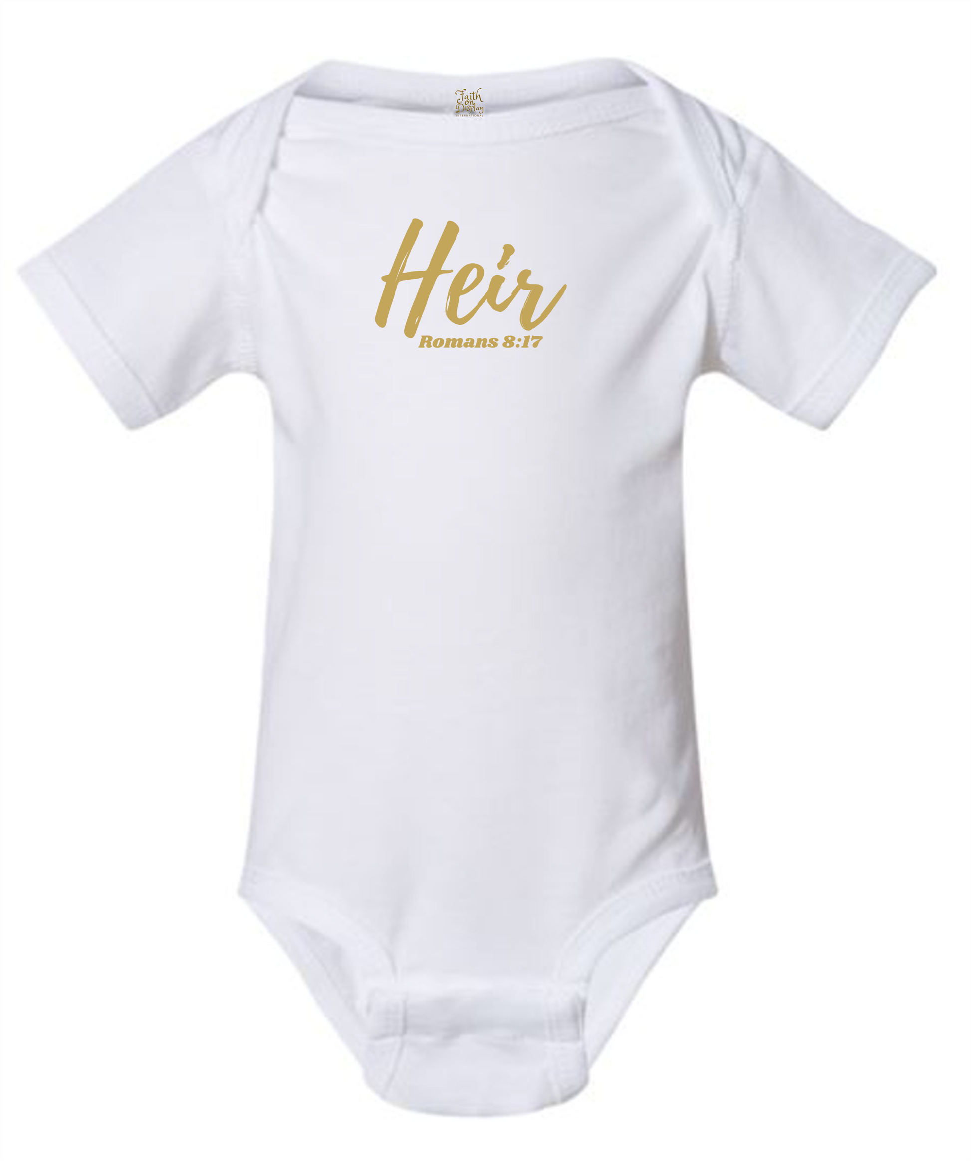 The Infant Baby Heir Onesie of high quality is inspired by Romans 8:17: Now if we are children, then we are heirs—heirs of God and co-heirs with Christ, if indeed we share in his sufferings in order that we may also share in his glory. Option for wear under a white zip fleece hoodie.